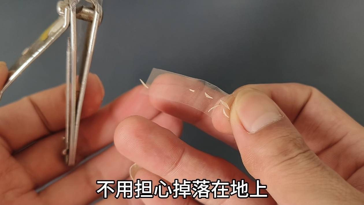 可以看到,剪指甲时,指甲碎屑不再乱飞,而是被两边的胶布粘住。这样不仅处理方便,也不用担心碎屑到处乱蹦。