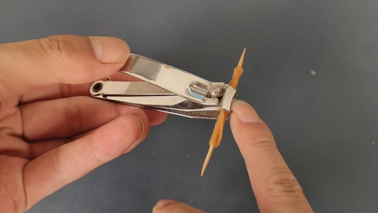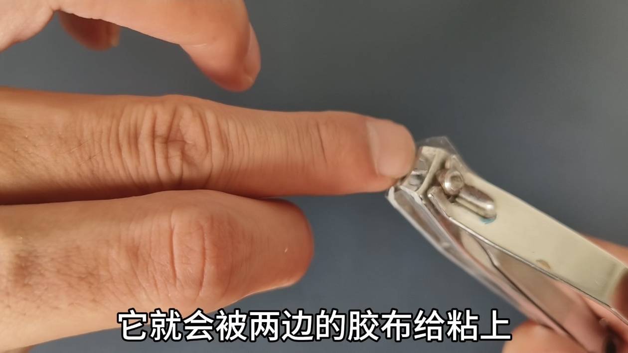 接着把缠好橡皮筋的牙签放入指甲刀内,可见其并不影响指甲刀正常使用。再来试试效果,还是以剪指甲为例。